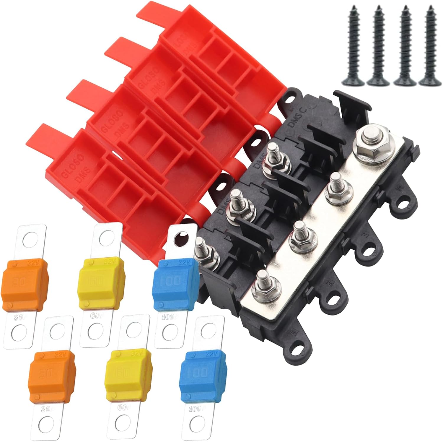 Applications: For main branch primary fusing configured to fit up to 6 MIDI fuses all bussed to a single input stud. Rating: MIDI Fuse Block 200A Maximum Total Combined Rating is 400A Continuous. Temperature:-40°C(-40F)to 85°C(185F) Torques: Mounting: 22 in-lbs (2.5 Nm) Fuse Module: M5, 44 in-lbs (5 Nm) Input Module: M8,88 in-lbs(10 Nm) Material: Cap by Silicone Rubber,200°C Max. Base by PPS,94V0 Grade,230°C Max. Keps Nut Studs(MIDI Fuse Block): M5 Stainless Steel, K-nuts Related Products: BDFS (MIDI Fuse,23-200A) Package Included: 1x Midi Fuse Holder