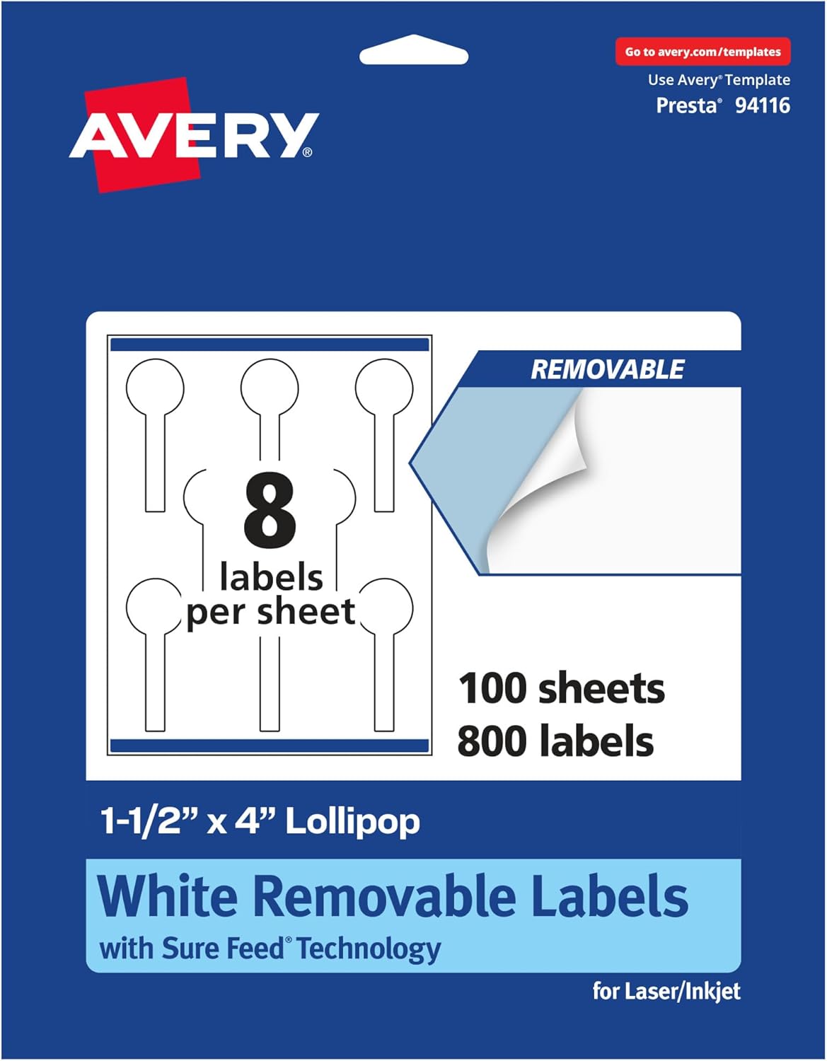 Add an elegant touch to home organization labels, price labels, jar labels, jewelry box labels and more with Avery 1.5" x 4" Matte White Removable Lollipop Labels. Made with matte white paper and removable adhesive, the removable Avery labels stick and stay but remove cleanly. Apply these removable white labels to smooth surfaces such as paper, plastic, cardboard, glass, or metal and peel them away without leaving behind messy residue. Avery lollipop labels are carefully constructed with patented features to provide the best results. Sure Feed technology reduces jams or smudges by creating a more reliable feed through your printer. The print-to-the-edge layout lets you print beautiful full-bleed designs that fill each blank sticker to the edge. The dual-compatible printable labels are compatible with both laser printers and inkjet printers. Easily customize labels with your own designs, art, symbols, and messaging in Avery Design & Print. Whether you’re looking for labels to help organize your home, labels for a school project or product labels that will grab people’s attention, Avery Matte White Removable Labels are the perfect choice for any project.