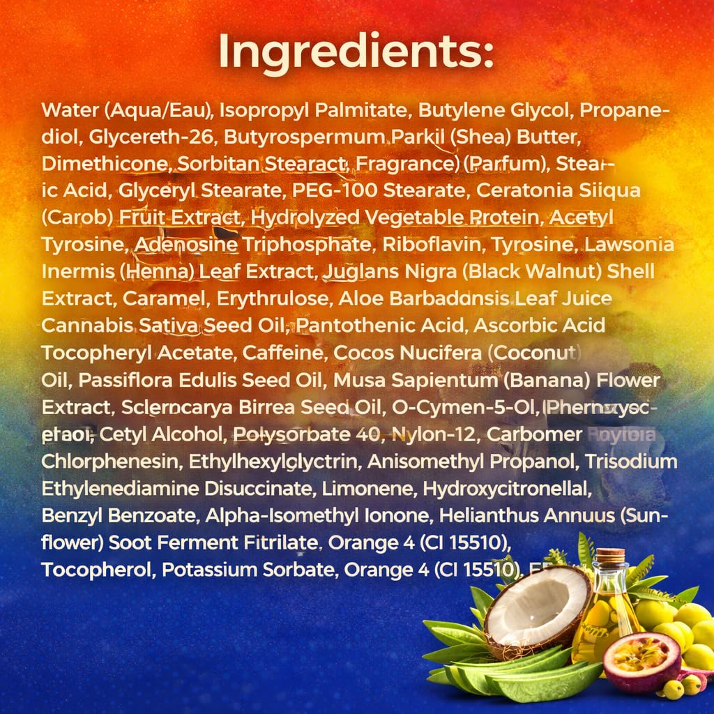 Chasing Sunsets Natural Bronzer Tanning Bed Lotion – 9.5 fl. oz. What It Is Hemps Chasing Sunsets Natural Bronzer Tanning Lotion is a multi-action tanning lotion designed to enhance the appearance of a deeper, radiant tan while conditioning and moisturizing the skin. Formulated with erythrulose, cosmetic bronzers, and skin-nourishing oils, it delivers immediate cosmetic color with gradual, natural-looking tone development. What It Does This lotion helps create a smooth, even bronzed appearance by combining natural bronzers with tanning accelerators and hydration-focused skincare ingredients. The formula supports a uniform finish while leaving skin feeling soft, conditioned, and refreshed. Tanning Benefits Tan Maximizers: Help support the skin’s natural tanning process during UV exposure for enhanced bronzed results. Tyrosine: An amino acid commonly used in tanning formulas to support melanin activity. Cosmetic Natural Bronzers: Provide instant, streak-free color to help even skin tone. Erythrulose: A naturally occurring sugar that develops a gradual, uniform sunless color over 24–48 hours for a natural-looking finish. Skin Care Benefits Aloe Vera: Helps soothe and condition skin while supporting moisture balance. Hemp Seed Oil (THC-Free): Rich in omega fatty acids to help moisturize and support the skin barrier. Shea Butter: Helps soften dry skin and improve overall skin comfort. Vitamins B5, C & E: Antioxidant vitamins that help condition skin and support a healthy-looking appearance. Caffeine: Helps skin feel refreshed and energized. Coconut Oil: Helps hydrate and condition while supporting a longer-lasting tan appearance. Passion Fruit Extract: Helps soften and condition skin while protecting against environmental stress. Banana Flower Extract: Helps hydrate and nourish skin for a smooth, radiant look. Marula Oil: A lightweight oil rich in antioxidants and fatty acids to help moisturize and improve skin suppleness. Fragrance Passionfruit Banana Flower with notes of passionfruit, banana flower, and apple blossom. PAO (Period After Opening) & Expiration This product is non-perishable when unopened and does not have a fixed expiration date. Once opened, use within the PAO timeframe indicated on the packaging to ensure best quality and performance. Storage Instructions Store tightly closed in a cool, dry place away from direct sunlight and excessive heat. Avoid contamination by keeping the cap securely closed when not in use.