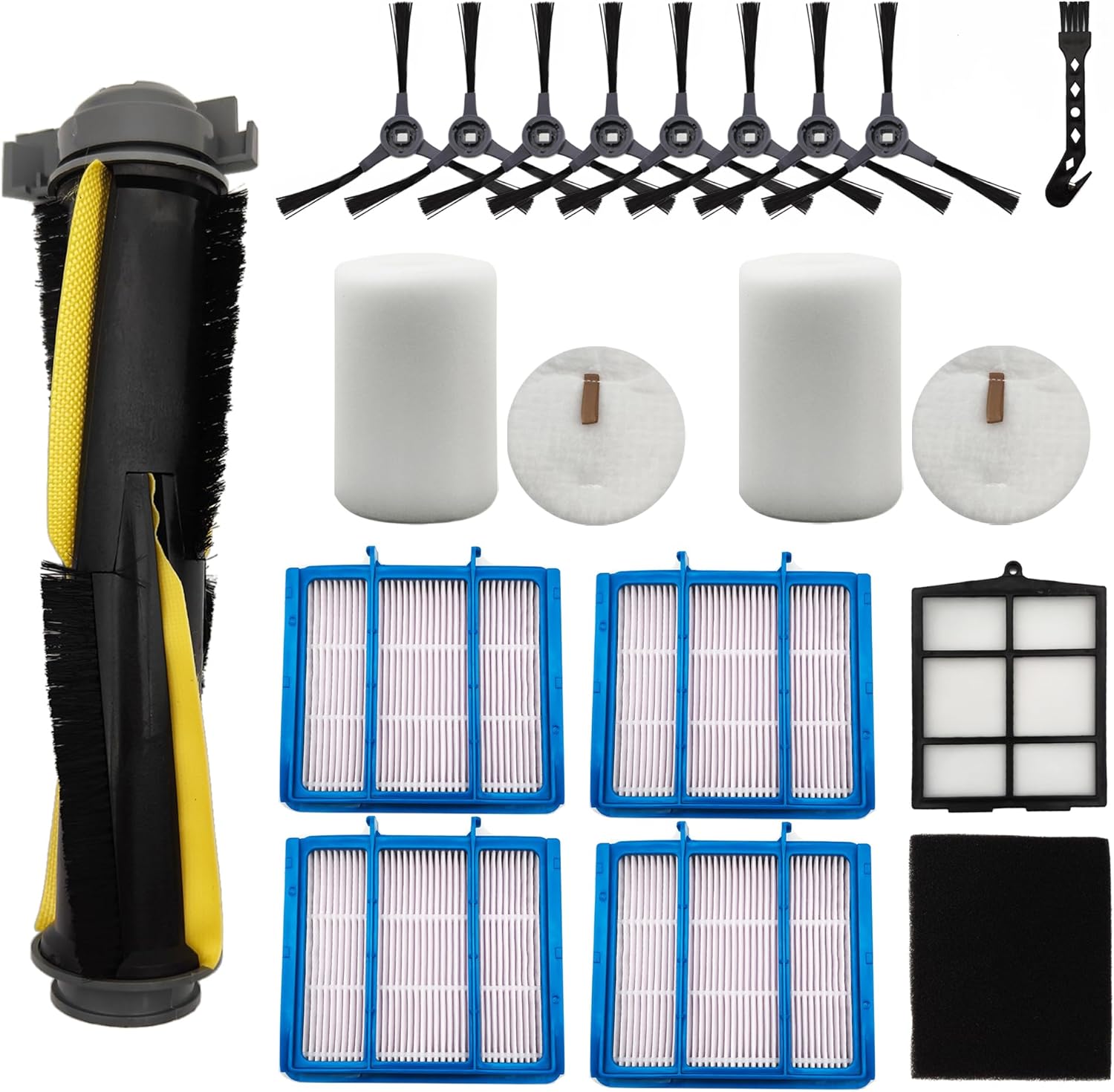 【Package content】1 Main Brush, 2 Filters, 2 Filter Mesh, 6 Side Brushes, 4 Black Filter Cotton, 3 White Filter Cotton 1 Cleaning Brsh; 2 Main Brush, 2 Filters, 2 Filter Mesh, 6 Side Brushes, 2 Black Filter Cotton, 2 White Filter Cotton, 1 Cleaning Brsh.