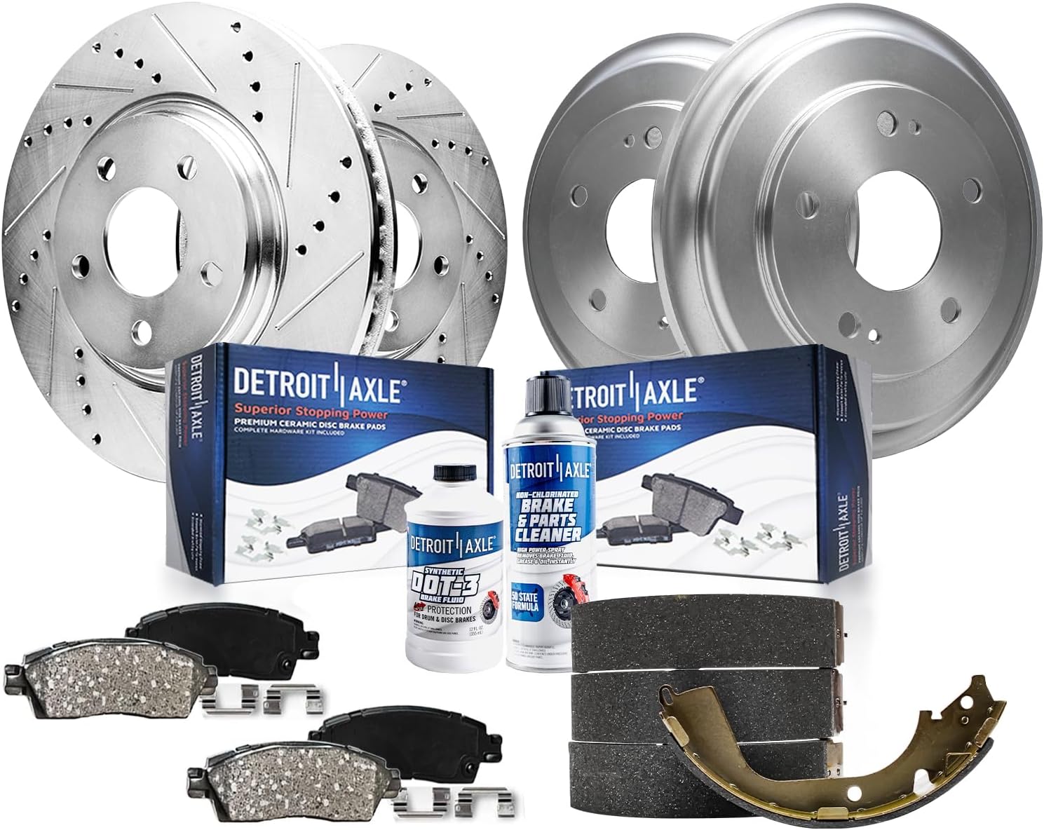 Kit Includes:2x Rear Premium Semi-metallic Brake Shoes: SH-752Fitment:Replacement for 1997-2002 Ford Expedition (To 3/18/02)Replacement for 1997-2008 Ford F-150 (Rear Parking Brake Shoes)Replacement for 1998-1999 Ford F-250 (Rear Parking Brake Shoes)Replacement for 2002 Lincoln Blackwood (Rear Parking Brake Shoes)Replacement for 2006-2008 Lincoln Mark LT (Rear Parking Brake Shoes)Replacement for 1998-2002 Lincoln Navigator (Rear Parking Brake Shoes)Replacement for 2003-2011 Lincoln Town Car (Limousine; Rear Parking Brake Shoes)Introduction:Detroit Axle is a leading global retailer and distributor of OE re-manufactured and new aftermarket auto parts. We are committed to providing first-class products and outstanding customer service at an incredible value. Our rapidly-expanding product line includes CV Axles, Wheel Hub & Bearings, Suspension & Chassis parts, Complete Strut Assemblies, Shock Absorbers, Drilled & Slotted Brake Rotors, Conventional Brake Rotors, Ceramic Brake Pads, Brake Fluids, Brake Cleaners, Rack & Pinion Assemblies, Gearboxes, Drive Shafts, Transmissions, Brake Calipers, Wheel Lug Nuts, and more. With over 30 years of experience, we are proud that millions of customers around the world rely on Detroit Axle parts. We have two Metro Detroit storefront locations on the north and west sides of the city. Our flagship location, in the heart of Detroit’s 8 Mile Road, is a combined retail storefront and over 180,000 square feet of the warehouse that serves as our global distribution center.