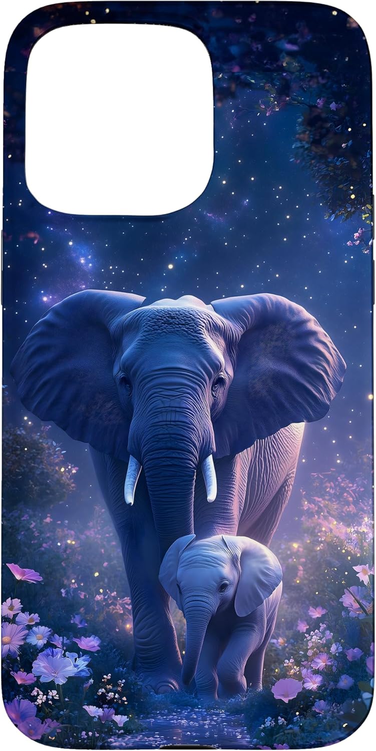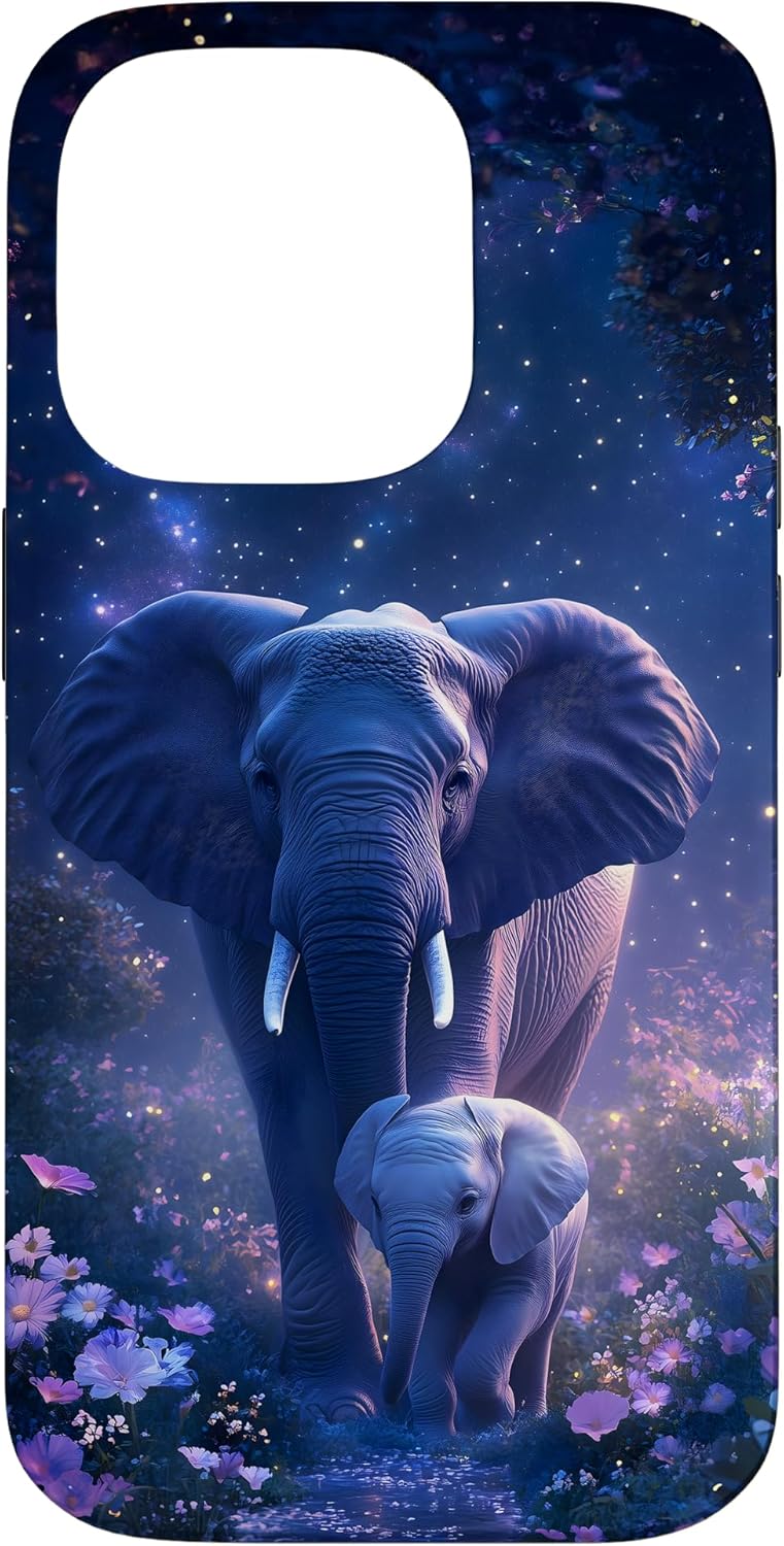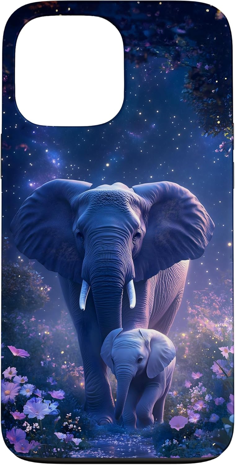 Elephant Dreams design. This design features a majestic adult elephant and its calf surrounded by a dreamy, starry night and colorful flowers. Ideal for nature enthusiasts and those who love elephants and wildlife. This design is one-of-a-kind and captivating. You'll surely make an impression and get many compliments. It unites style and refinement.