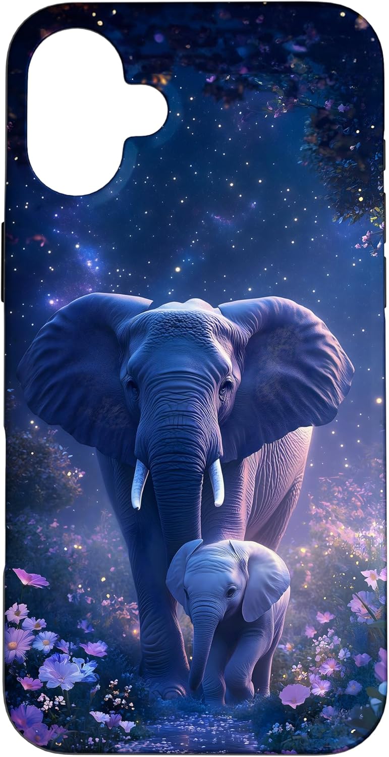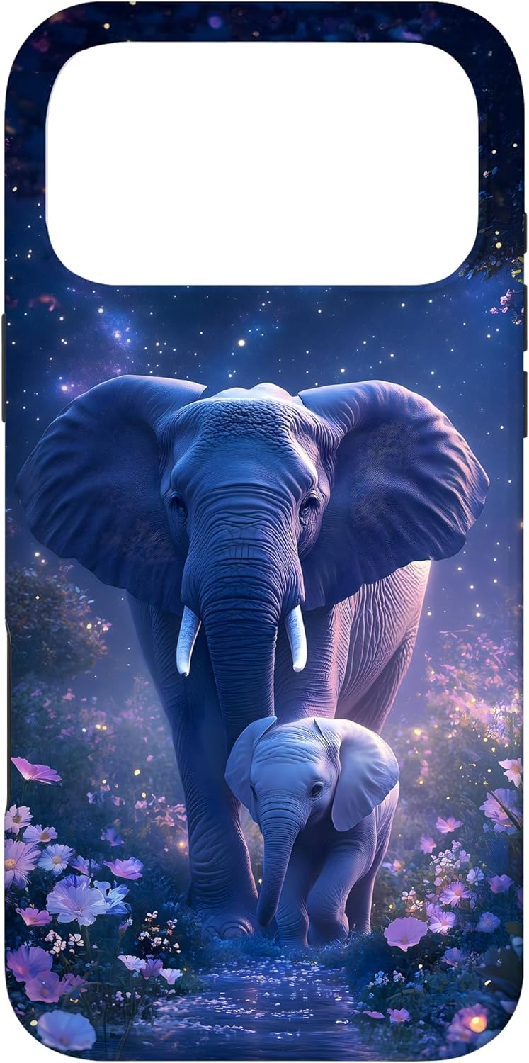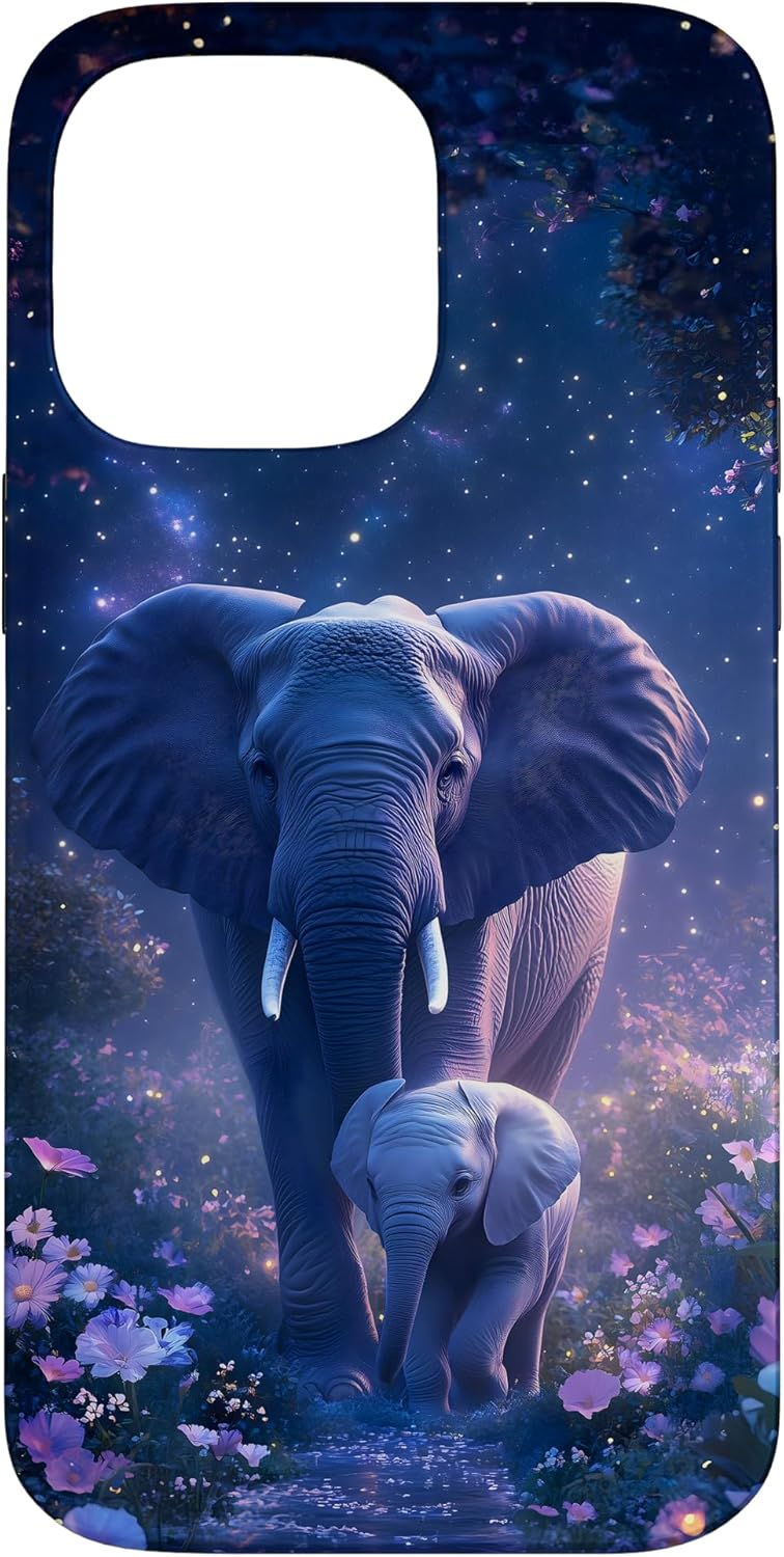 Elephant Dreams design. This design features a majestic adult elephant and its calf surrounded by a dreamy, starry night and colorful flowers. Ideal for nature enthusiasts and those who love elephants and wildlife. This design is one-of-a-kind and captivating. You'll surely make an impression and get many compliments. It unites style and refinement.