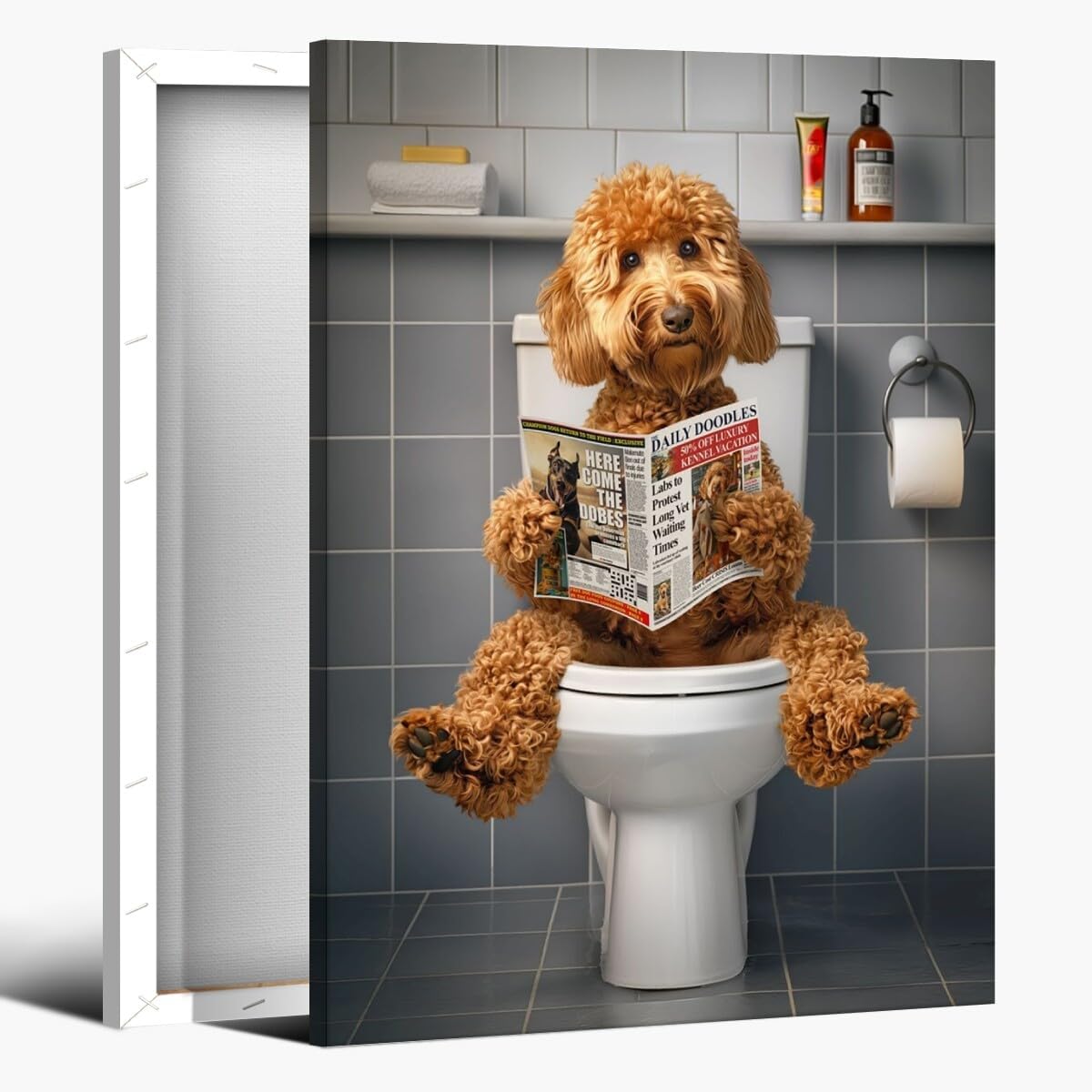 - Specifications:- Color: Color- Printing: Canvas- Package includes: Funny Bathroom Goldendoodle Dog Wall Art Posters- Various styles, pay attention to the size selection, we have framed and unframed options!!!Transform your bathroom into a fun and inviting space with this Funny Bathroom Goldendoodle Dog Wall Art Poster. Designed to add a playful touch, this cute Goldendoodle poster is the perfect piece of animal wall art to brighten up your bathroom. Featuring a lovable Golden Retriever in a humorous pose, this artwork combines charm and style, making it a great addition to any bathroom decor.1.Perfect for Dog Lovers:Whether you’re a fan of Goldendoodles or just love pets, this dog wall art brings your passion to life. Its fun and friendly design makes it ideal as both dog wall decor and a statement piece in any bathroom wall art collection. The artwork’s detailed portrayal of a Goldendoodle makes it a must-have for any dog decor enthusiast.2.Versatile and Stylish Wall Art for Any Room:While ideal for bathrooms, this dog poster can also be displayed in other rooms such as the living room, bedroom, or even the office. Its universal appeal allows it to function as both animal wall decor and a fun conversation starter in any setting. Add a touch of whimsy to your space with this unique dog poster.3.Premium Canvas Print:Crafted from durable materials, this poster is printed on high-quality canvas, ensuring it retains its vibrant colors and sharp details. The canvas wall art format adds a professional finish, making this bathroom wall decor both long-lasting and easy to maintain.4.Easy to Hang and Display:This lightweight dog poster is easy to hang in any bathroom or room of your choice. Its compact size makes it the perfect fit for small or large spaces, enhancing your bathroom wall decor effortlessly.