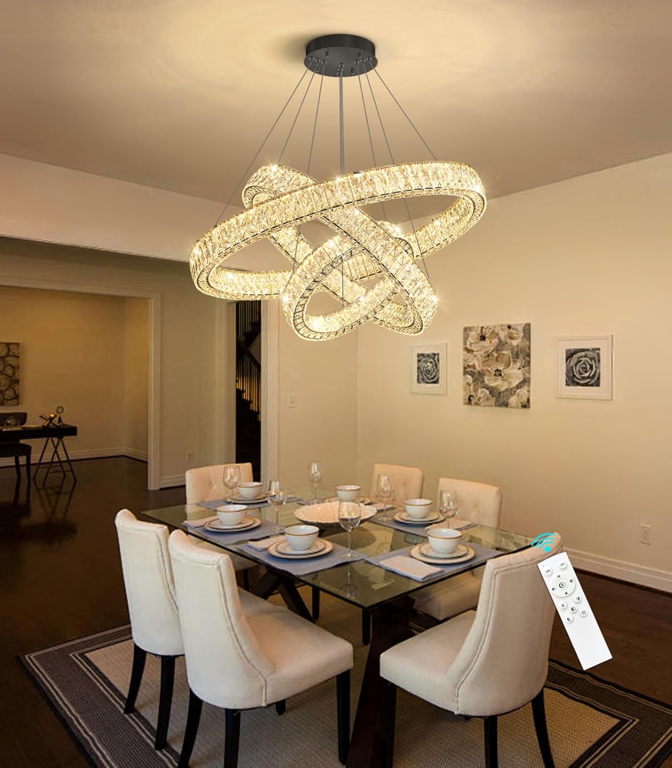 Illuminate your space with sophistication using this stunning Modern Ring Chandelier Light Fixture. The contemporary design features elegant LED rings that create a captivating visual centerpiece perfect for dining rooms, entryways, or living spaces. This pendant light combines sleek aesthetics with practical illumination, casting a beautiful glow that enhances any room's ambiance. The suspended rings create an artistic dimensional effect, making this fixture both a light source and a conversation-starting design element. The LED technology provides consistent, long-lasting illumination while maintaining a modern profile. Whether installed in a minimalist setting or a more elaborate interior, this chandelier adds architectural interest and refined style to your ceiling space. The clean lines and circular geometry make it versatile enough to complement various decor styles, from contemporary to transitional.