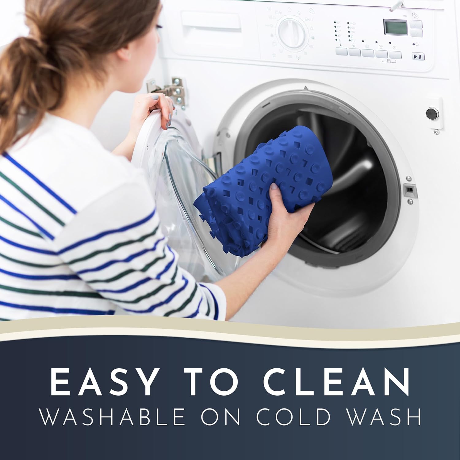 Dimensions 34.5 x 15.5 inches Bathtub Mat and 21 x 21 inches Shower Mat FAQs & IMPORTANT INFORMATION FOR THE USAGE 1. On what surfaces do the mats work? Only use our mats on clean, smooth, and untextured shower trays or tub floors. On structured surfaces the vacuum won't build up in the suction cups. 2. What do I need to do before using the shower mat? It's mandatory to rinse the shower beforehand - it should be properly wet - and then firmly press and smooth the mat with your hands or, with a secure stance, your feet on the floor of the tray. Check to make sure it's securely in place before stepping on it. 3. How can I take care of the mat? Our mat is inherently made from a durable material and is machine washable. We strongly recommend rinsing your mat after each use and hanging it to dry on the supplied hooks. This way, you'll enjoy the mat for years! 4. How can I hang the shower mat to dry? Place the self-adhesive hooks on a clean, dry, and smooth surface, and simply hang the mat on the drain holes. To remove the hooks, gently warm them with a hairdryer and peel them off from one corner. They are reusable. 5. My shower mat has wrinkles - what can I do? After unpacking, it's possible that the shower mat might be a bit "folded." Don't worry! Simply place it in hot water - either in a tub or installed to the shower floor - it will quickly smooth out. 6. Can the mat be used with a drain in the center of the shower? Yes, the extra-large holes allow for optimal water circulation and drainage - regardless of where the drain is located. 7. Is the mat made of? Our mat is made of skin friendly vinyl (PVC) and is regularly tested on-site by a registered testing institute in accordance with Article 59, Paragraph 10 of the REACH Regulation.