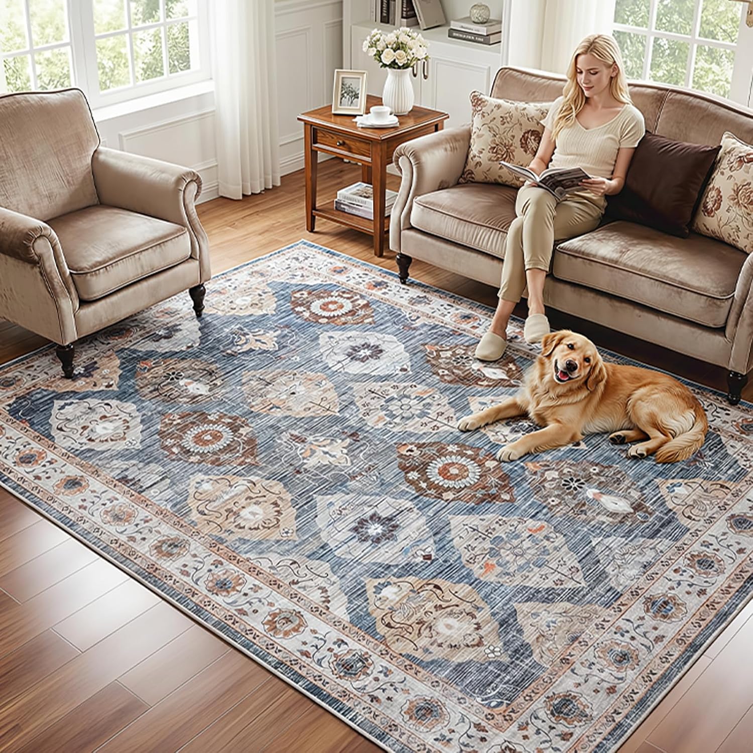 • Vintage Style with Subtle Charm: The area rug showcases a soft geometric pattern in light blue, adding a touch of timeless character to any space. This carpet versatile design blends well with various decor styles, from modern to casual, creating a warm atmosphere