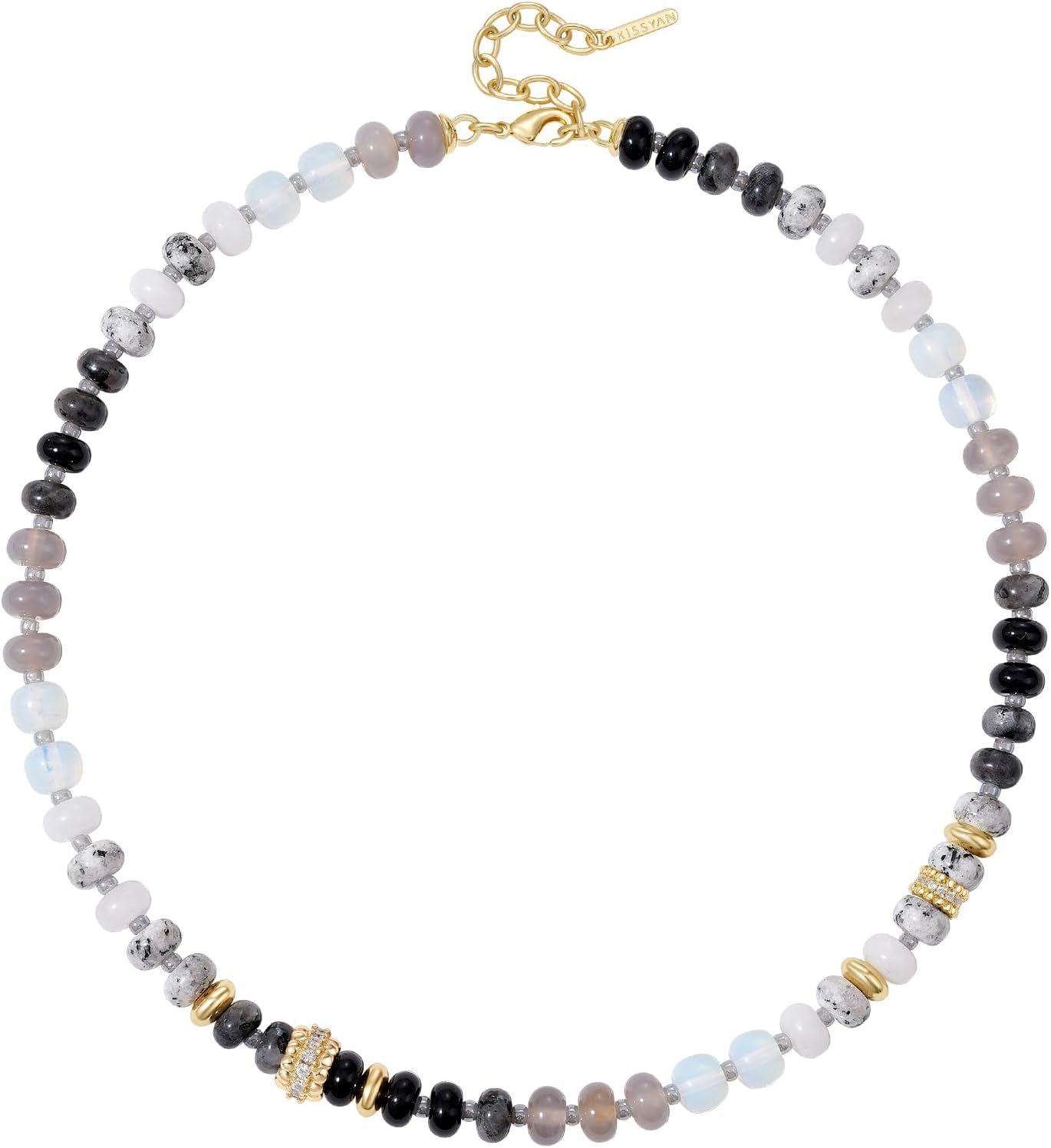 KissYan Beaded Necklaces for Women, Adjustable Natural Gemstone Choker with 14K Gold Plated Cubic Zirconia Beads Handmade Jewelry Gift