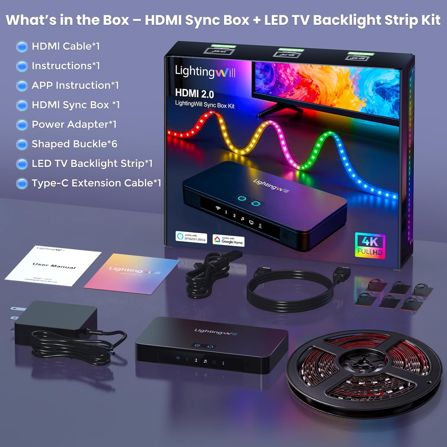 | Included Components | HDMl Cable*1 Instructions*1 APP Instruction*1 HDMl Sync Box *1 Power Adapter*1 Shaped Buckle*6 LED TV Backlight Strip*1 Type-C Extension Cable*1 |