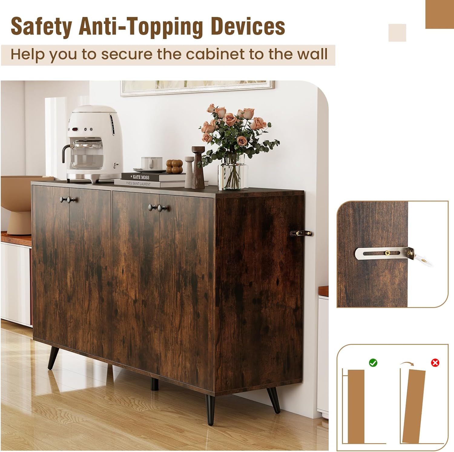 Description: Maximize storage and style in any space with this buffet cabinet! Crafted to provide ample storage, the buffet sideboard features 4 doors that open to reveal spacious interiors. Within, 5-position adjustable shelves offer flexible storage solutions to accommodate items of various sizes. Designed with 5 elevated support legs, this floor cupboard offers a stable and secure structure. Enhanced with anti-toppling devices, this unit ensures stability and security. Not just for dining room, this versatile piece doubles as a stylish display cabinet to any space. Features: Spacious cabinet top complements storage and display space 4 storage compartments with 5-position adjustable shelves for various needs Safety anti-topping devices help you to secure the cabinet to the wall Reliable 5-point supportive structure is built to last Extra middle legs improve stability and boast great support Elevated design makes floor cleaning a breeze Equipped with flexible metal hinges for convenient use Convenient knobs for opening and closing the doors Easy-to-clean surface saves much effort in daily upkeep Thoughtful details of the buffet cabinet for better user experience Assembly needed Specifications: Color: White + Black/ Rustic Brown + Black Material: Engineered Wood, MDF, Metal, Plastic Overall Dimensions: 50" x 15" x 31.5"(L x W x H) Dimensions inside the Cabinet: 24" x 13.5" x 25"(W x D x H) Off-Ground Clearance: 5" Weight Capacity of Tabletop: 110 lbs Weight Capacity of Adjustable Shelf: 25 lbs Weight Capacity of Bottom Shelf: 110 lbs Net Weight: 68 lbs Package Includes: 1 x Buffet Cabinet 1 x Instruction