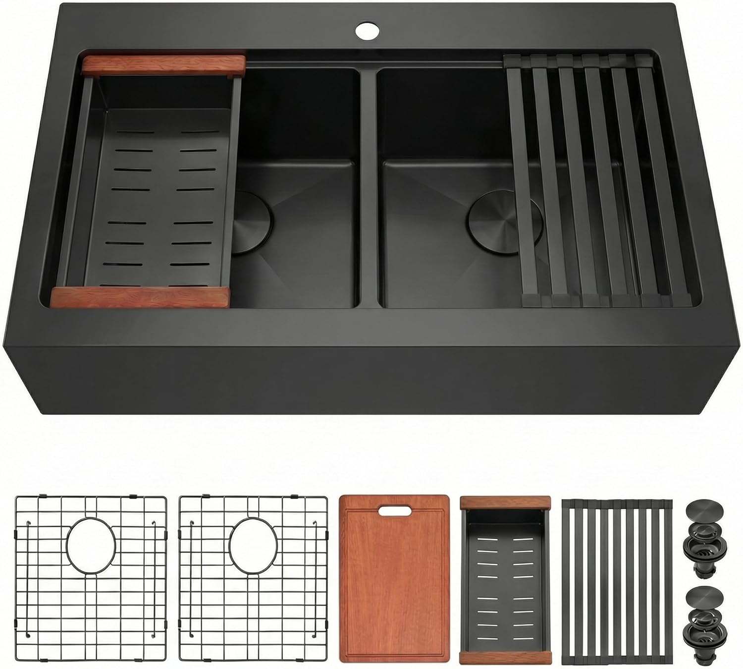 | Included Components | black kitchen sink(x1), colander(x1), roll-up drying rack(x1), sink grids(x2), sink strainers(x2), cutout template(x1) and mounting clips |