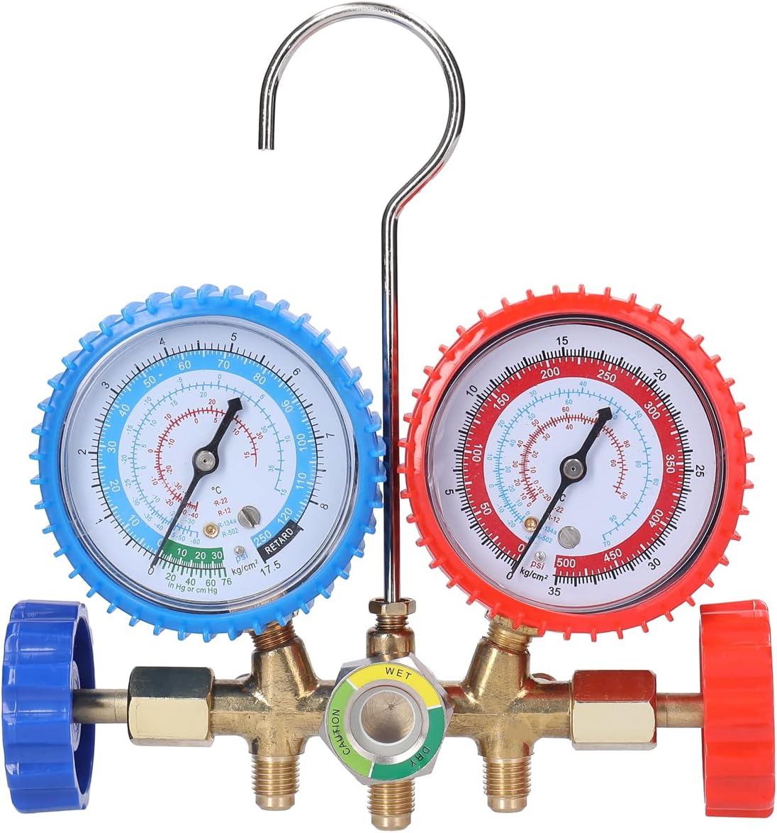 This is a kind of professional manifold gauge set for diagnosing refrigeration systems troubles and measuring pressure in refrigeration equipment. Made of fine quality material, practical to use and with fine durability, so it can stand to frequent use and accidental damage. Read easily with large windows, display 6 datas on the gauge meters, PSI(30psi to 250psi), kg/c㎡(0kg/c㎡ to 17.5kg/c㎡), R12, R134A, R22, R502. You can have a try. Specifications: Name: Refrigeration Guage Set Material: metal+plastics Hose length: 1.5m / 59.06in Item size: Guage size: 175 * 130 * 50mm / 6.89 * 5.12 * 1.97in Connector size: 54 * 25 * 25mm / 2.13 * 0.98 * 0.98in Item weight: 1294g / 2.85lb Package size: 216 * 200 * 95mm / 8.50 * 7.87 * 3.74in Package weight: 1411g / 3.11lb Packing List: 1 * Refrigeration Guage 3 * 1.5m Hose 2 * Connection Adapter 1 * Back Hook