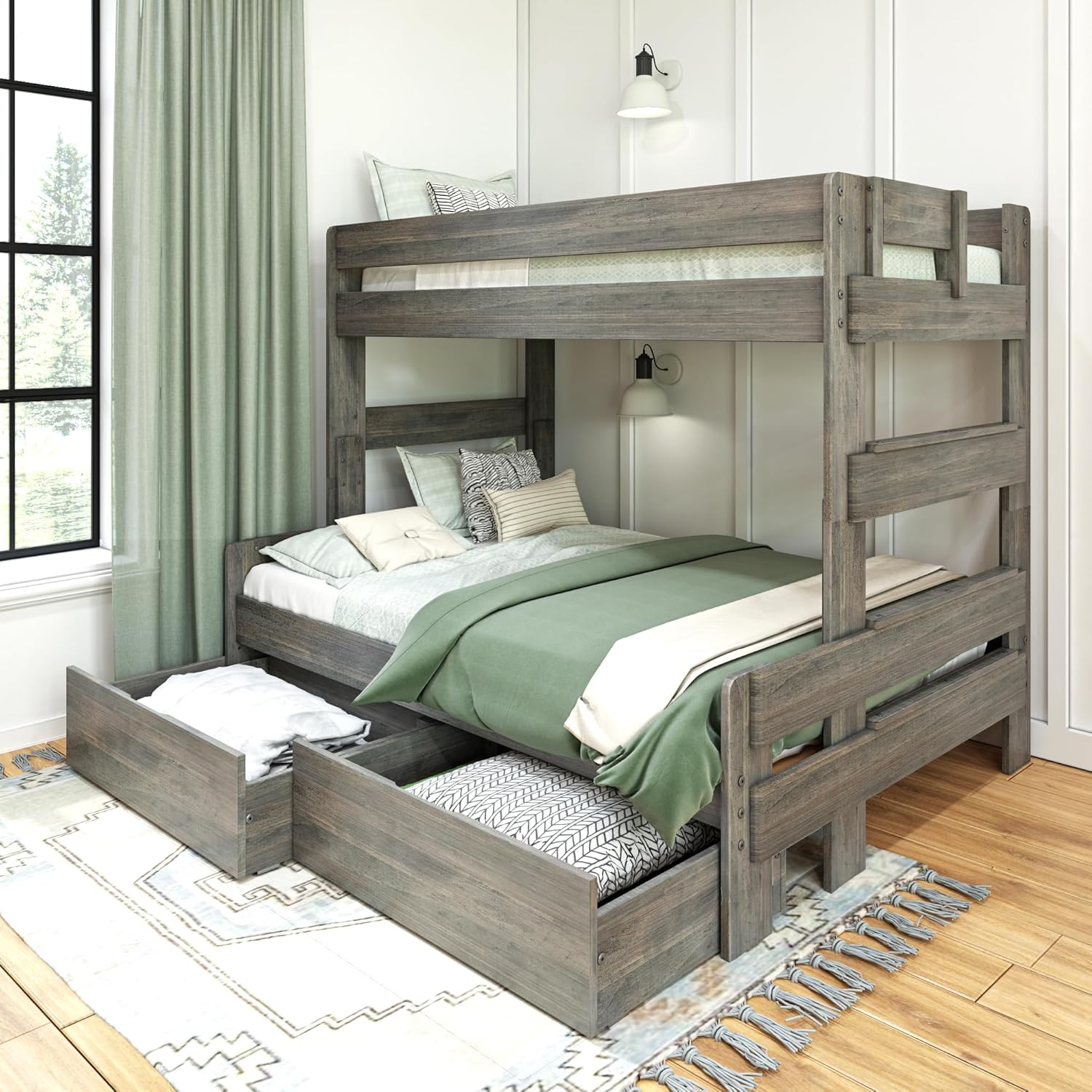 Bring the fun of the farm in with the Modern Farmhouse Twin Over Full Bunk Bed with Trundle from Max & Lily. With a fabulous barnwood finish and enhanced safety, this bed offers the perfect combination of fun and functional that kids and parents love. The durable, non-toxic, low-VOC finish makes this bed a safe choice for any kids room. Sleep and storytimes feel secure thanks to a 400 lb resting weight capacity for each sleeping surface. Added twin trundle bed makes sleepovers simple. Solid New Zealand pine wood construction, solid plywood slats and metal support bar provide strong, durable support. Works with standard twin and full-size mattresses and does not require box springs or bunkie boards. Super safe design meets or exceeds Federal safety standards for kids furniture. Ships in three boxes with instructions and hardware included. 2+ adults make assembly quick and easy. When it’s time for play, this beds’ space saving design frees up plenty of room for kids to be kids. The Modern Farmhouse Twin Over Full Bunk Bed with Trundle from Max & Lily offers exceptional quality and affordability that kids and their parents will enjoy for years to come. Max & Lily is a member of the Maxwood family of brands - the kids furniture experts bringing a tradition of superior quality, safety and fun!