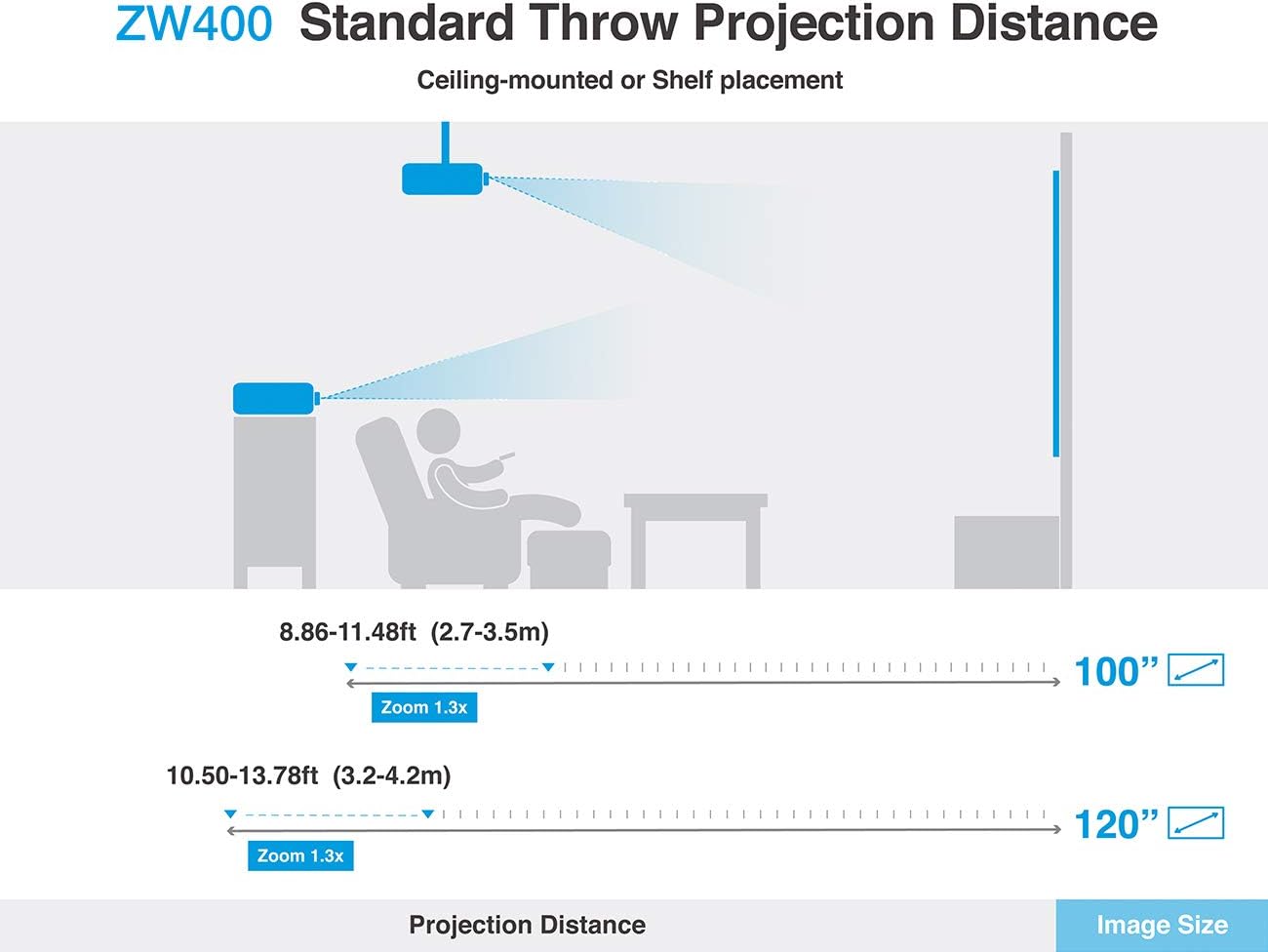 Brighten any room with razor-sharp, 4,000 lumen, WXGA projection with the remarkable Optoma ZW400. DuraCore laser technology eliminates lamp and filter replacements for up to 30,000 hours of low-cost and virtually maintenance-free operation. Compact size, low weight and quiet operation make it perfect for classrooms, meeting rooms, board rooms and digital signage. Vertical keystone, 360° and portrait mode operation enable flexible installations. HDMI and VGA inputs provide connectivity to high-quality 4K HDR digital video or legacy analog video sources while LAN and RS-232 enable control via Extron, AMX or Telnet. A 10W speaker provides rich audio for all-in-one applications.