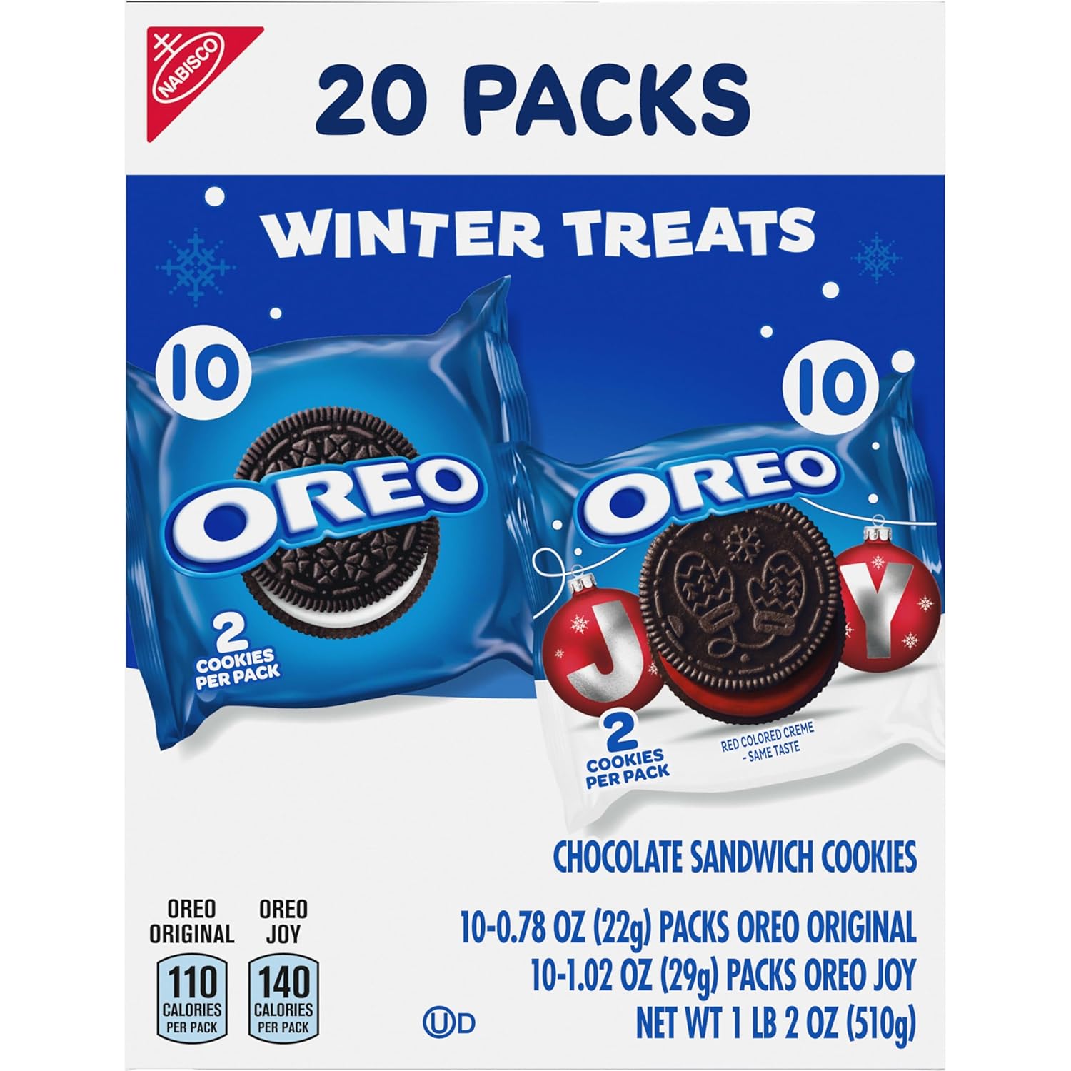 Spread joy this holiday season with the OREO Winter Treats Holiday Cookies Variety Pack, featuring the classic OREO sandwich cookies you’ve always loved with a festive Christmas twist. The cookie mix includes 10 packs of original OREO Chocolate Sandwich Cookies, that are Always Made with Real Cocoa, and 10 packs of OREO Joy! Holiday Cookies with red-colored classic OREO creme and six assorted winter designs. Each snack pack contains two full-size OREO cookies, making these OREO cookie packs a fantastic alternative to Christmas candy. OREO sandwich cookies are sweet treats to enjoy during Christmas movies, and the two-cookie snack packs are wonderfully fun snacks to use as stocking stuffers and cute holiday gifts for friends, family, coworkers, and neighbors. These certified kosher snack cookies also make wonderful office snacks, school snacks, and holiday party snacks, so toss these holiday treats in lunchboxes to surprise loved ones or in Christmas treat bags and cookie boxes as party favors. Milk's favorite cookie is sure to spark joy, and with this bulk cookies box of individually wrapped snacks that are ready to grab and go, you’ll be ready for the holiday season and any snacking occasion.