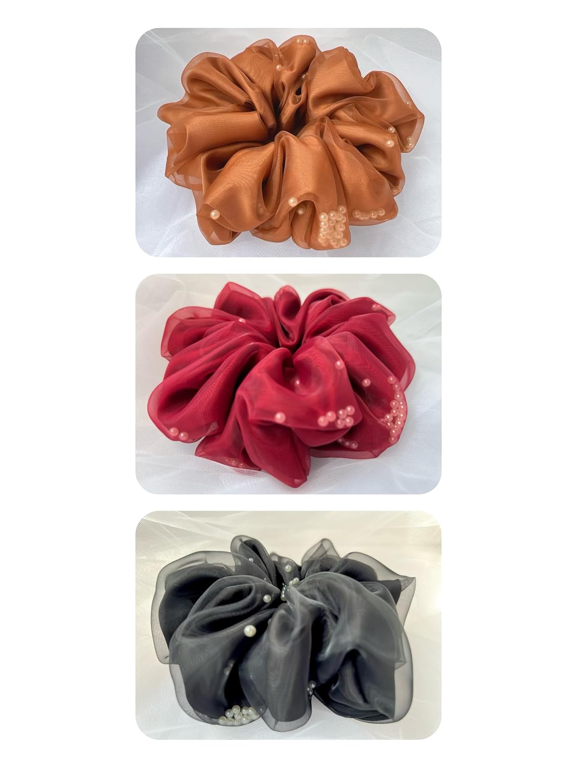 Organza Jumbo Scrunchie for Hair, Oversized Tulle Ruffle Elastic Hair Tie Scrunchie for Women, with Gracefully Shifting Pearls Design - 3 PCS (Colors: Ivory, Bronze, Red )