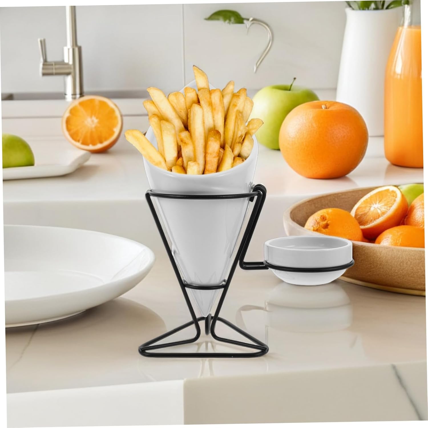 Package List 1 x French Fries Rack Characteristics -Unique appetizer serving dishes: elevate dining experiences with a stylish ceramic fry holder set, perfect for presenting appetizers and snacks in a refined and professional manner snacks ceramic bowl with cone -Modern aesthetic: combines contemporary and classic design, seamlessly fitting into various kitchen or restaurant decor styles porcelain serving platters -Material:Iron, ceramic french fries rack -Size:23.00X21.00X10.00cm/9.04X8.25X3.93in french fry cone holder -ceramic appetizer serving plate: made from ceramic, ensuring use and easy cleaning for handy maintenance snacks serving cup with cone basket -Color:White fries holder -Stable construction: designed for secure placement, this fry holder set adds convenience and elegance to any dining table or countertop ceramic snacks cup -Versatile usage: ideal for serving french fries, chips, and other snacks, suitable for restaurants, home gatherings, or casual parties appetizer holder with cone rackGoods Descriptionmetal wire cone for chips This Western-style ceramic french fry holder set is perfect for restaurants and home use.french fries holder The ceramic material durability and a sophisticated look, making it a great addition to any dining experience.french fries cone holder The elegant design features a cone-shaped basket and a matching plate, ideal for serving appetizers, snacks, and side dishes