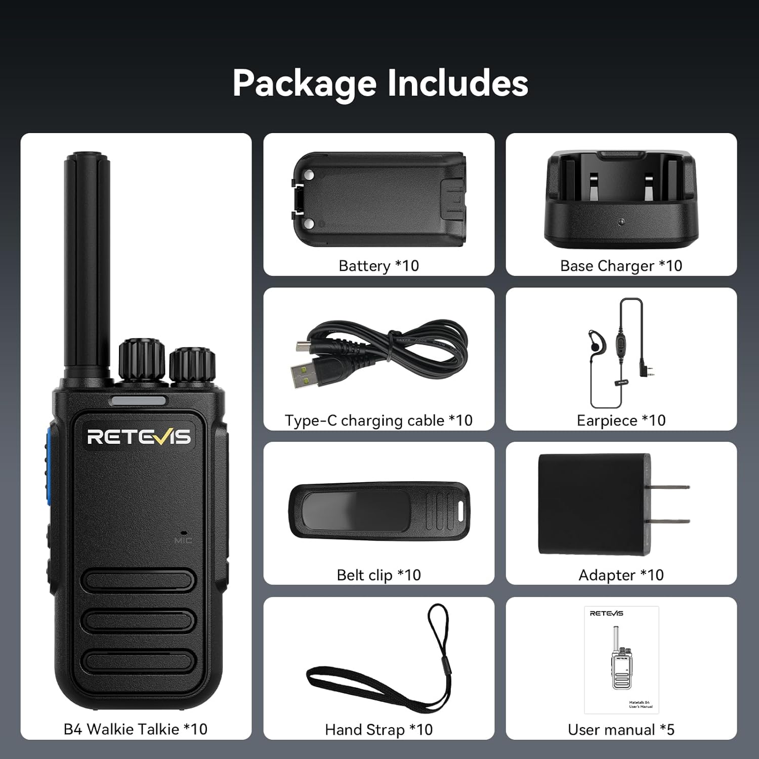 | BuiltIn Media | 10 x B4 walkie-talkie and 1200mAh battery, 10 x Charger adapter, 10 x Charging base, 10 x Earpiece, 10 x Type-C charging cable |