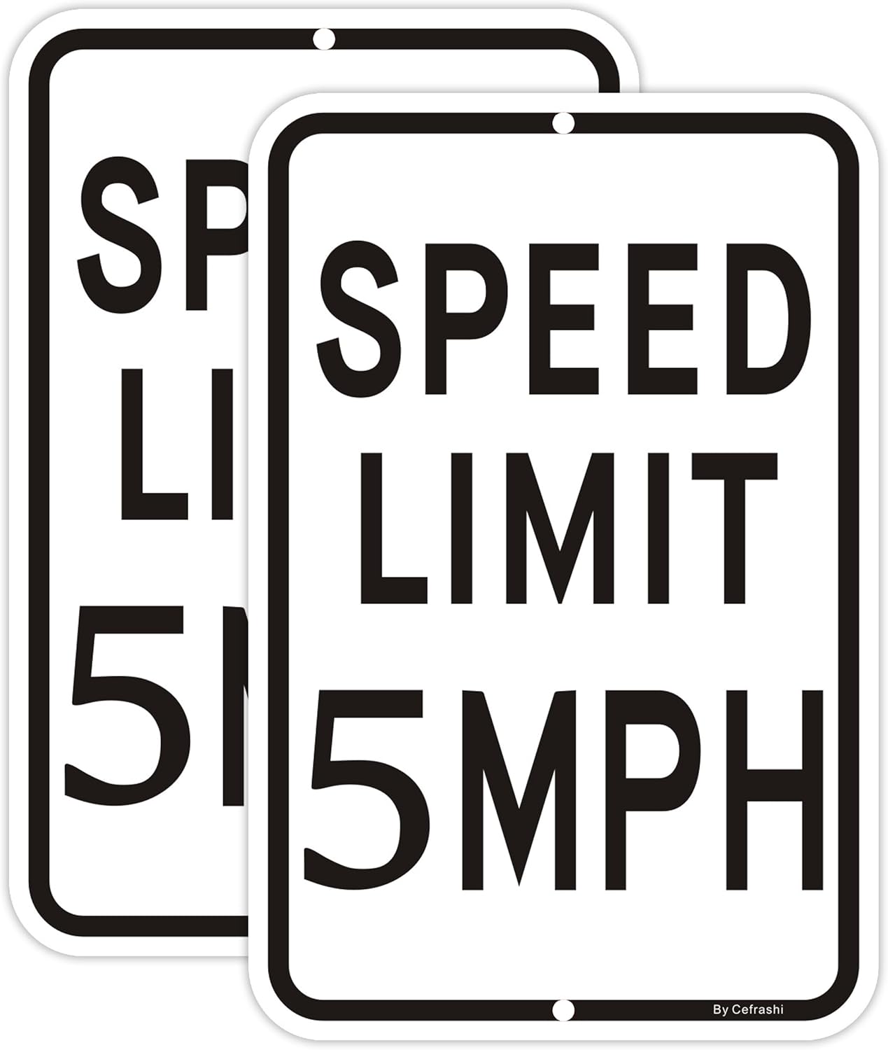 Enhance safety and traffic control in your area with this 2-pack of professional-grade speed limit signs. Each sign measures 14x10 inches and is constructed from durable, reflective aluminum material that ensures high visibility both day and night. The bold red text on white background clearly displays "SPEED LIMIT 5 MPH," making it easily readable from a distance. These signs come complete with 36-inch metal stakes for secure ground installation and include all necessary mounting hardware. Perfect for parking lots, private roads, residential communities, school zones, or any area where maintaining slow speeds is crucial for safety. The weather-resistant construction stands up to outdoor conditions while maintaining its reflective properties. Installation is straightforward with the included hardware and stakes, allowing you to establish effective speed control quickly and efficiently.