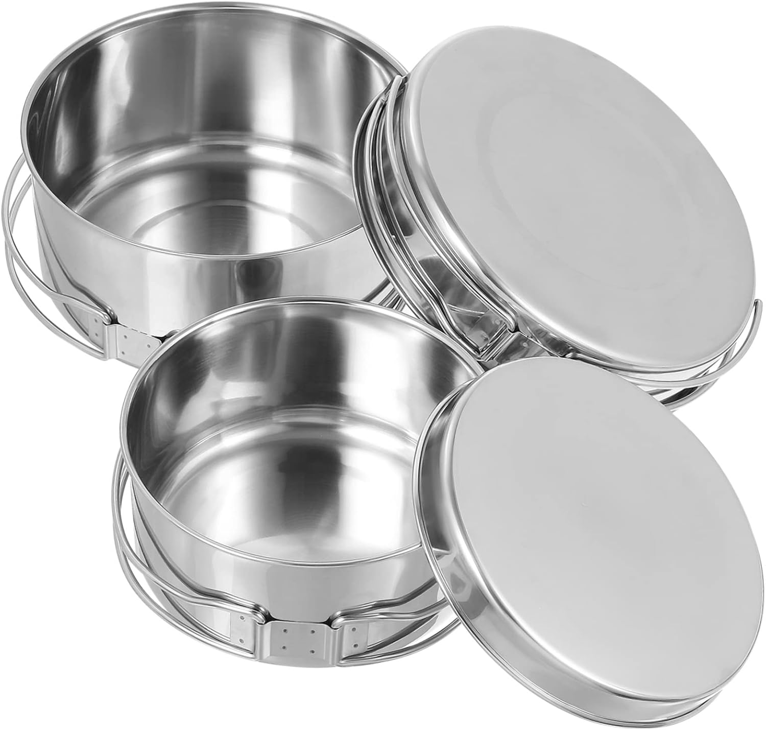 Package List 1 x 936ml Camping Pot 1 x 577ml Camping Pot 1 x 516ml Camping Pan 1 x 136ml Camping Pan Characteristics -Capacity: 516ml, 136ml, 577ml, 936ml camping cooking pot pan -516ml Size:15.70X15.00X3.20cm/6.17X5.89X1.26in non stick pan -Color:Silver lightweight camping pot -Material:Stainless Steel camping stackable pans -136ml Size:13.20X12.50X1.60cm/5.19X4.91X0.63in camping cooking utensils -577ml Size:12.60X11.50X6.00cm/4.95X4.52X2.36in backpacking cookware -936ml Size:14.50X13.50X7.00cm/5.70X5.31X2.75in non stick camping cookware Made of stainless steel material, this camping pot pan set is wear-resistant and anti-scratch for use outdoor dining tableware. With foldable handle and stackable design, this camping pot and pan can be stacked to space outdoor cooking pot. With smooth body and non-stick effect, this outdoor camping cooking pot and pan is easy for you to clean outdoor camping non-stick frying pan. This cooking pot pan set has wide applications, such as outdoor camping, picnic, hiking, , etc camping cooking pot.Goods Descriptionstainless steel cooking utensils This product is a practical outdoor camping cooking pot and pan set.lightweight pots for rv It saves of space in the outdoor kitchen and backpacking.camping cooking pot pan You can use it to bake and cook all food.camping stackable pans Whether cooking on a camp stove or over a campfire, the camping cookware set is the ideal companion for your hiking trips