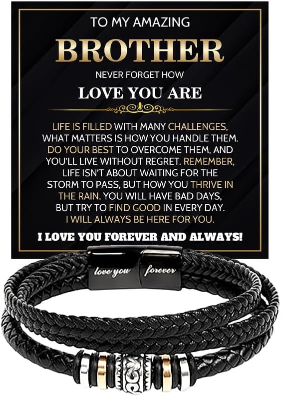 • 【Unique Gifts Mens Bracelet Leather】The knot bracelet for Brother comes with a meaningful wish card and a wonderful box. Gifts in the box will add some mystery and surprise and anticipation when you are giving your him the gift. This contents of the card represent your best intentions and wishes and promises. So let him know that you will always be there for him and love him forever.
