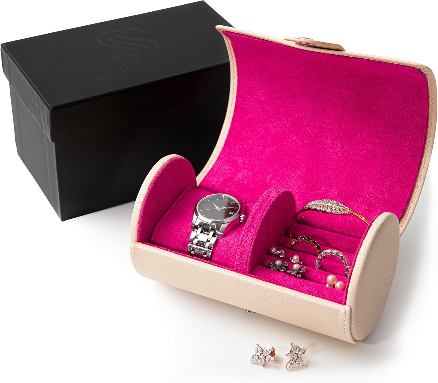 Elevate your travel style with this luxurious travel jewelry case — a perfect blend of elegance, practicality, and protection. Thoughtfully designed for women who love their accessories, this small jewelry box keeps your valuables beautifully organized wherever you go. Crafted with a scratch-resistant, easy-to-clean vegan leather exterior, the jewelry box is built to handle every journey with ease. The plush velvet interior offers a soft, luxurious touch that gently cushions your jewelry, keeping it free from scratches and dust. A reinforced button closure ensures your items stay secure, while the compact and portable design fits effortlessly into your handbag, luggage, or carry-on. Inside, the versatile storage layout features a removable cushion insert for watch or smartwatch, along with dedicated spaces for rings, earrings, bracelets, and necklaces — everything you need in one elegant jewelry organizer box. This travel-ready jewelry organizer isn’t just functional — it’s stylish enough for your dresser and durable enough for your suitcase. Beautifully packaged in an elegant gift box, it makes a thoughtful choice for unique gifts for women, travel lovers, or anyone who appreciates luxury and organization in one compact design. Whether used as a travel jewelry organizer, watch holder, or everyday jewelry box, it’s the ultimate gift for women who have everything — a timeless companion for your treasured pieces.
